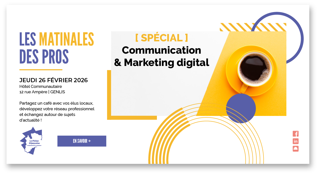 Le service Développement économique de la Communauté de Communes de la Plaine Dijonnaise a le plaisir de vous convier à une nouvelle Matinale des Pros sur le thème de la communication et au marketing digital, le jeudi 26 février 2025, de 8h30 à 10h30, dans nos locaux situés 12 rue Ampère à GENLIS.
